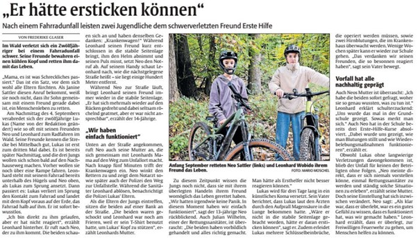 Dank ihres beherzten und klugen Eingreifens retten Neo Sattler und Leonhard Wobido (beide Klasse 9) einem Freund das Leben. Wir sind tief beeindruckt und stolz auf euch!