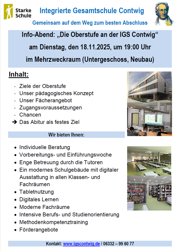 Neben dem Termin für den Info-Abend der kommenden 5. Klasse (12.11) und dem Termin für den Tag der offenen Tür (15.11.) können wir Ihnen nun auch den Termin für den Infoabend der Oberstufe mitteilen. Wir freuen uns, Sie am 18.11. in unserem Mehrzweckraum begrüßen zu dürfen!