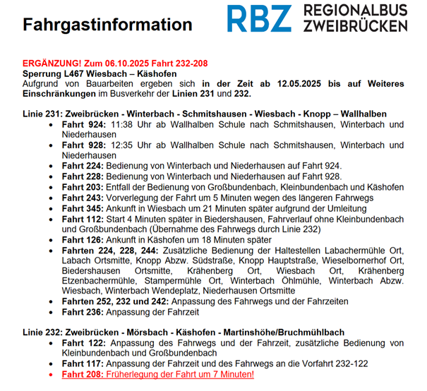Bitte beachten Sie die folgenden Fahrplanänderungen der Linie 231/232 aufgrund der Sperrung L467 Wiesbach-Käshofen: