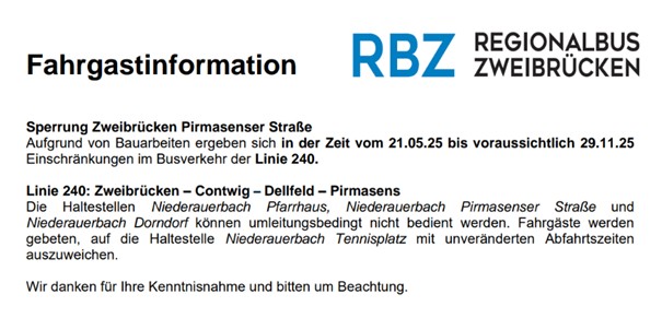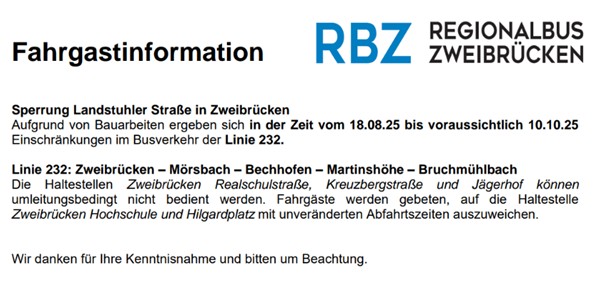 Bitte beachten Sie, dass die Linie 232-208 morgens von Bechhofen bis zum Ende der Baustelle Wiesbach – Käshofen 7 Minuten früher fährt.